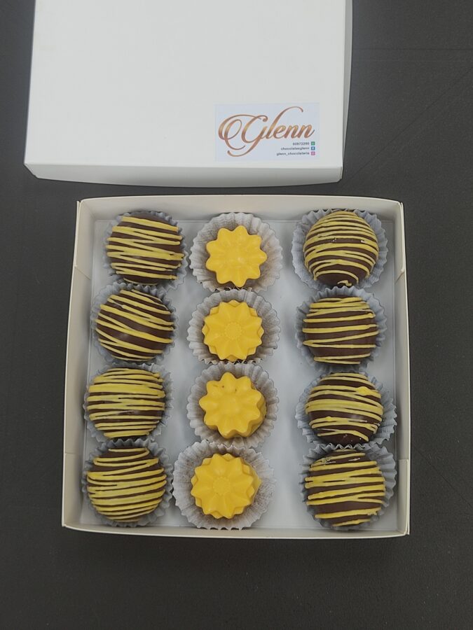 Hermosos y ricos chocolates con decorado en amarillo, que hacen que sea un detallito especial.