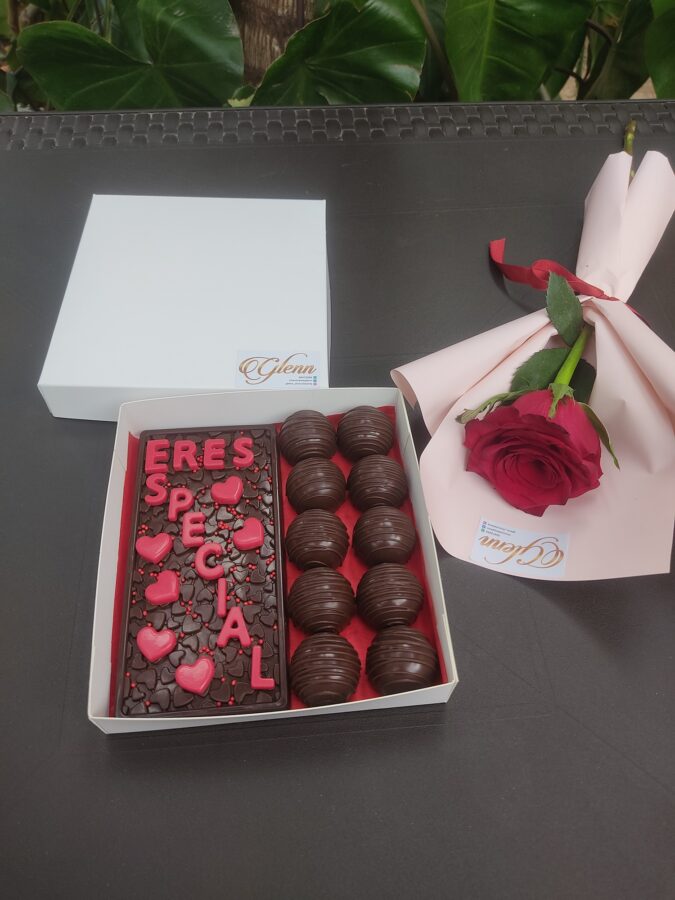Hermoso detalle de chocolates rellenos y frase corta personalizada, complementado con una Rosa roja que destila amor.