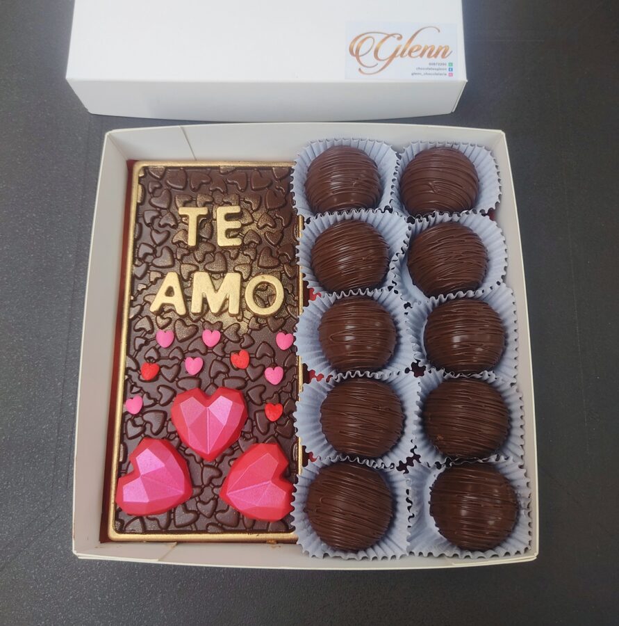Hermosa cajita con chocolates rellenos y personalizado con frase Te amo.