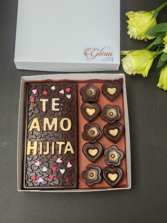Hermosa cajita de chocolates rellenos con frase personalizada.