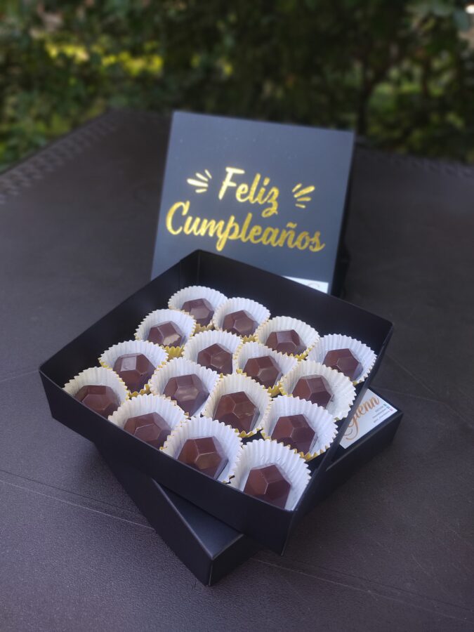 Hermosa cajita con chocolates rellenos de Nutella y frase personalizada, pedidos con un día de anticipación.