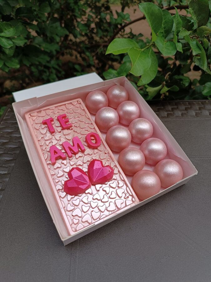Hermosa cajita de chocolates rellenos en color rosa con un decorado perla que le da un toque de elegancia.