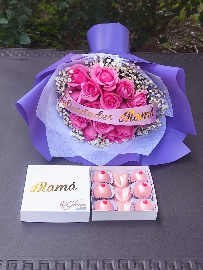 Hermoso ramo personalizado de rosas con ilusiones, acompañado con un rico detallito de chocolates rellenos.
