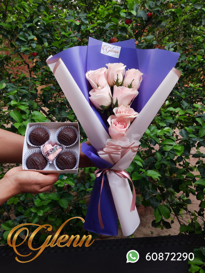 Hermoso ramo de rosas champagne con chocolates rellenos.