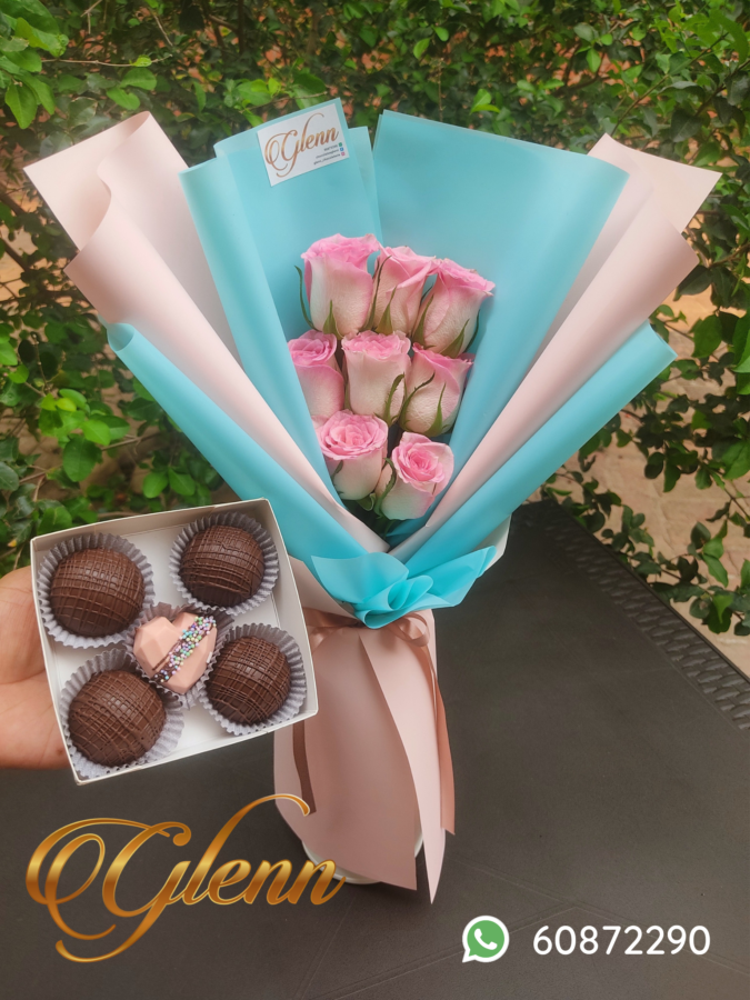 Hermoso ramito de rosas con chocolates rellenos, combinación que da alegría.