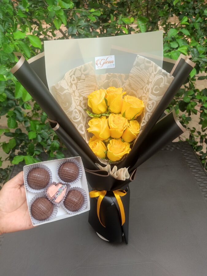 Hermoso ramito de 8 rosas amarillas, con chocolates rellenos.