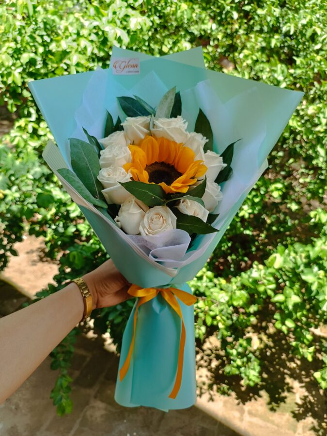 Hermosa combinación de rosas blancas con girasol y un toque de verde eucalipto.
