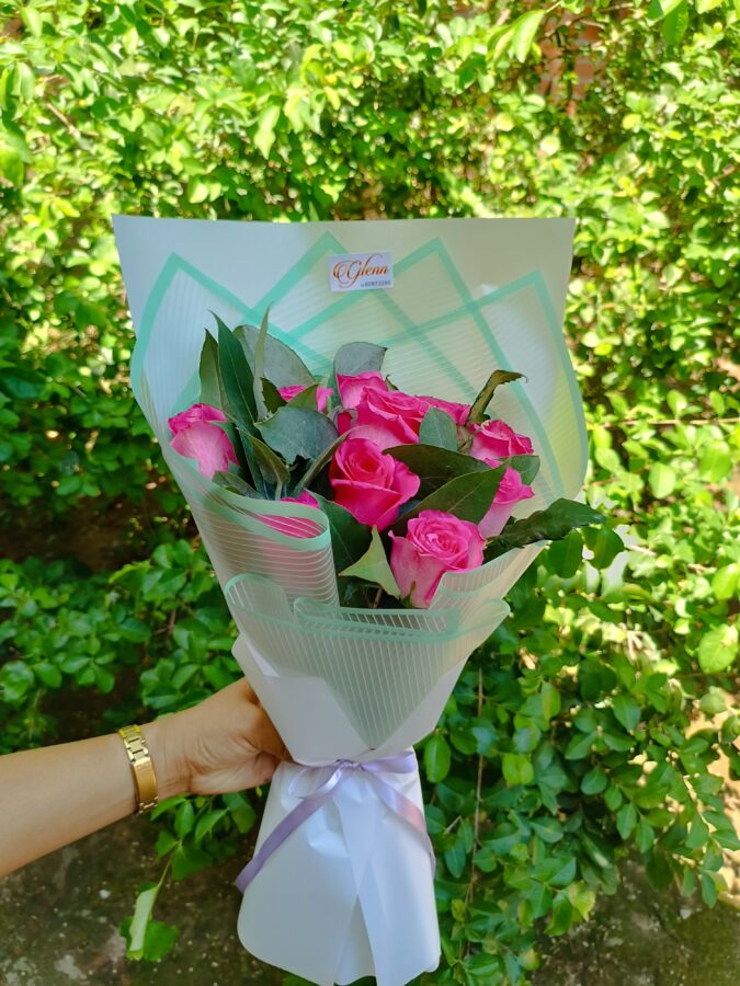 Hermoso ramito de rosas fucsia con un toque de hojas verdes de eucalipto, para darle mayor realce.